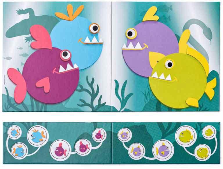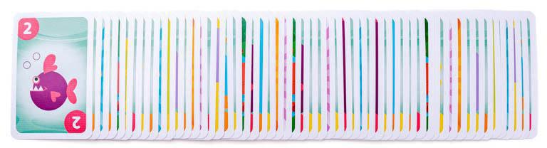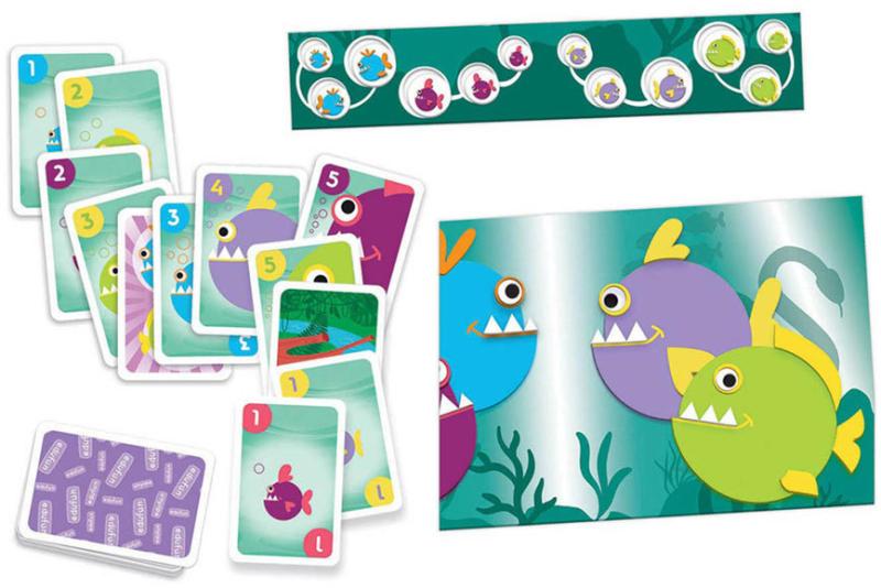 Obsah balení: 40 piraní ve 4 barvách a velikostech, 15 zvláštních kartiček (4 kartičky s dvojitou piraňou, 4 kartičky s překážkou na řece, 4 kartičky s hadem, 3 kartičky s žábou), hrací deska, pomůcka k počítání skóre,