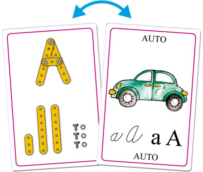 Jednoduché zábavné hry pro seznámení dětí s písmeny a číslicemi. Předškoláci i školáci si hravou formou procvičí jemnou motoriku, trpělivost, koncentraci, logické myšlení, představivost a paměť. Díky fyzickému skládání písmen a čísel si děti vštěpují jejich tvar a lépe si je zapamatují. Soubor je ideální pomůcka jak pro samostatnou, tak i pro kolektivní hru. Písmenka děti skládají dle předlohy s pomocí pevných kartonových dílů a plastových šroubů. Obsahuje CZ i SK variantu písmenek a návodů.
