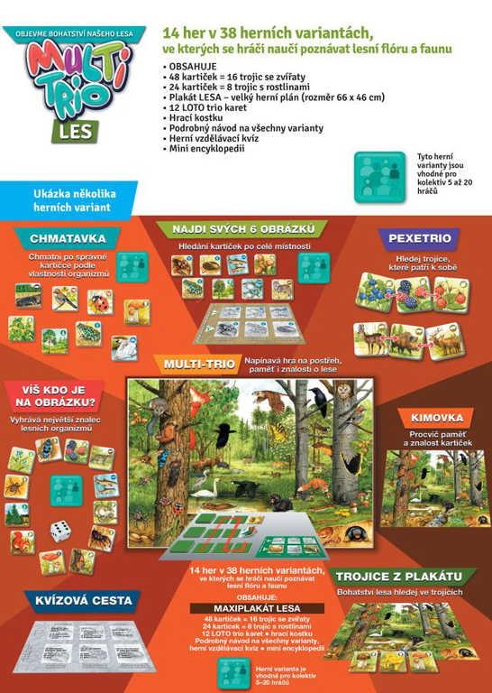Soubor 14 her (LOTO-TRIO, PEXETRIO, MULTI-TRIO, CHMATAVKA, Kvízové otázky atd) ve 38 herních variantách, ve kterých se hráči naučí poznávat lesní faunu a flóru. Velký plakát všech zvířat a rostlin, bohatá encyklopedie o všech zvířatech a rostlinách.