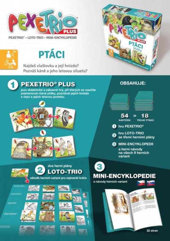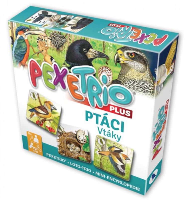 Pexetrio PTÁCI je zábavná hra inspirovaná pexesem, která děti zároveň i vzdělává. Děti se naučí poznávat různé ptáky, jejich hnízda s vejci a jejich letovou podobu podle hesla "škola hrou". Kromě toho, že si děti osvojí ptáky zábavným způsobem, hra také napomáhá rozvíjet jejich logické myšlení a trénovat paměť hledáním trojice kartiček s různými ptáky, jejich hnízdy s vejci a jejich letovou podobou.