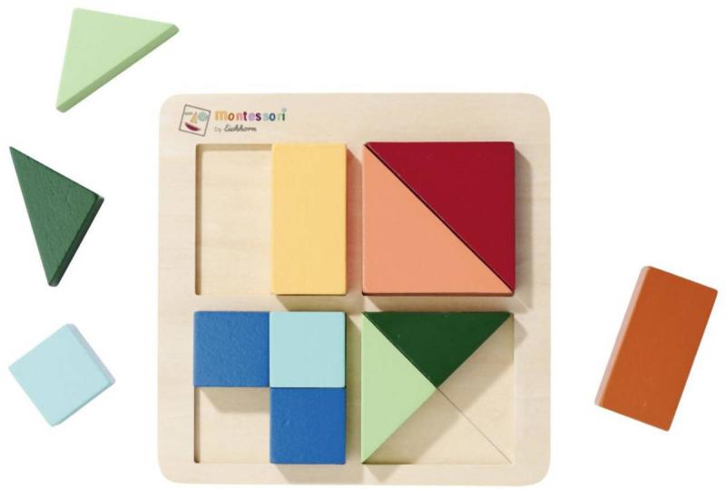 Montessori čtvercové geometrické puzzle nejsou jen pastvou pro oči. Deska se skládá ze 4 čtverců a obsahuje 12 dílků různých tvarů a barev. Cílem skládačky je vyplnit plochu čtverce. Dílky lze také míchat dohromady v různých barvách. Puzzle čtvercová skládačka Montessori je vyrobena ze 100% březového a lipového dřeva s certifikátem FSC a jsou vhodné pro děti od 2 let.