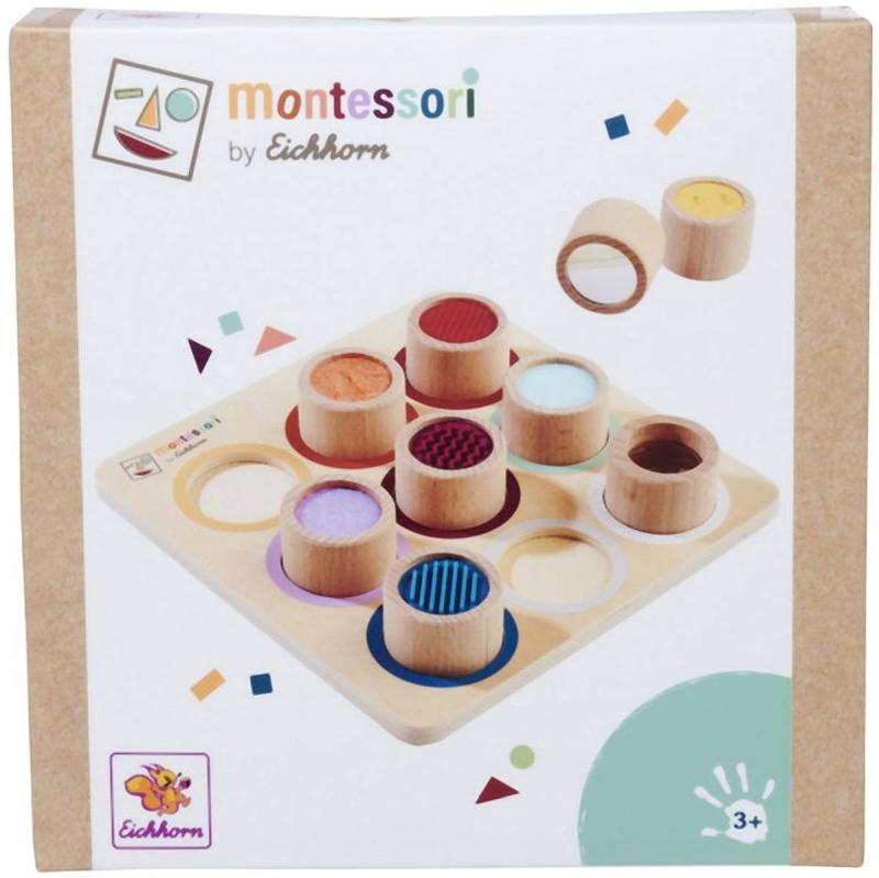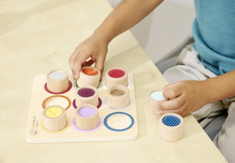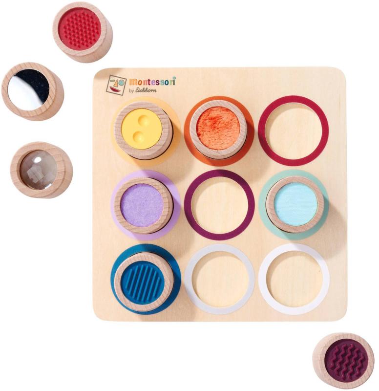 Vnímání je pro dítě důležitým smyslovým vývojem. Hra s různými povrchy a materiály podporuje hmat. Naše Montessori hmatová deska má 9 senzorických válců, ve kterých si dítě může osahat povrchy a textury. Montessori hmatová deska je vyrobena ze 100% bukového dřeva a překližky s certifikací FSC a je vhodná pro děti od 3 let.