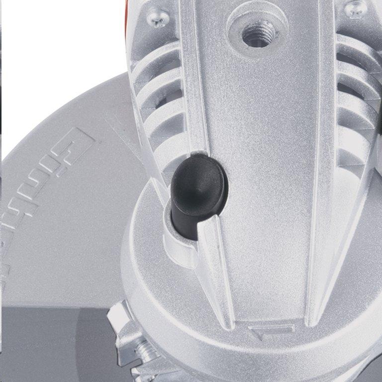 Kotouč o maximálním průměru 230 mm chrání posuvný bezpečnostní ochranný kovový kryt a snadno jej vyměníte pomocí zámku vřetena (klíč je schovaný v rukojeti). Plochá kovová hlava převodovky zamezuje rušivým vibracím při práci a zpřístupňuje těžko dosažitelná místa.
