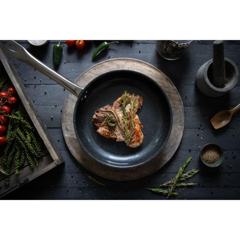 Tento povrch je založen na minerálně-keramické bázi a neobsahuje PFAS ani PTFE, což zaručuje bezpečnost pro zdraví i životní prostředí. Nabízí vysokou odolnost proti poškrábání a dlouhodobý nepřilnavý efekt, který umožňuje vaření s minimálním množstvím tuku. Díky tomu je pánev vhodná jak pro profesionální kuchyně, tak pro domácí použití.