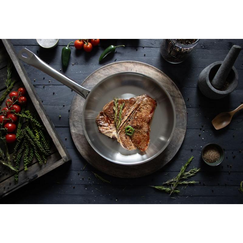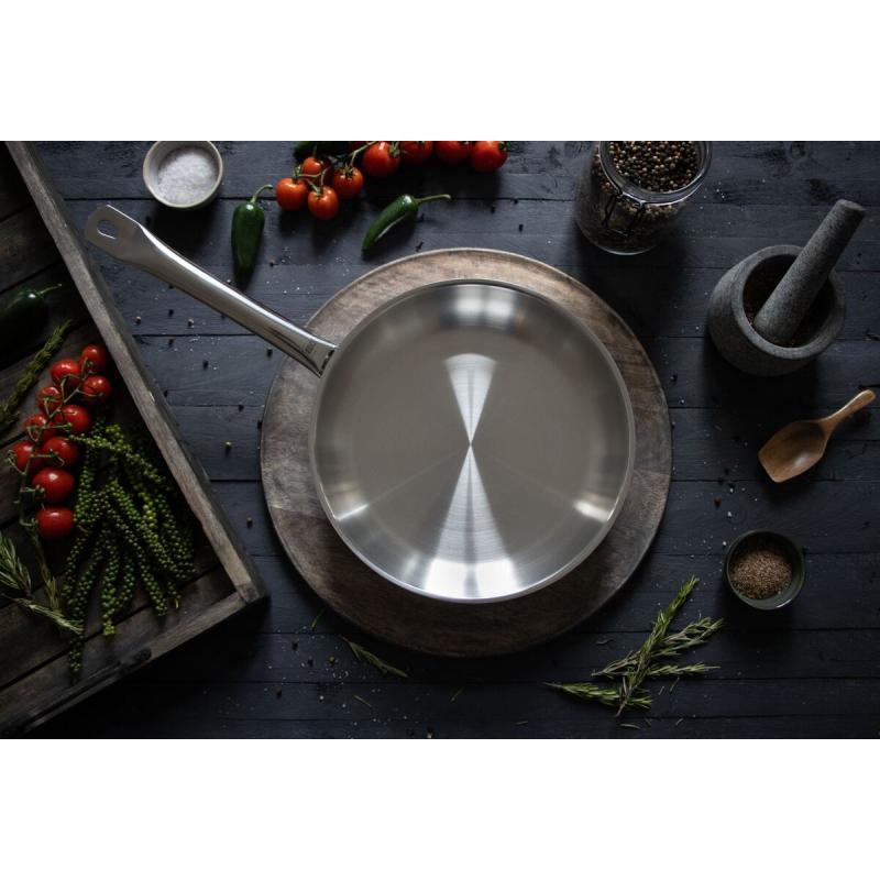 Vnitřní saténově matný povrch nejen působí elegantně, ale usnadňuje i čištění, které lze provádět i v myčce nádobí. Vnější část pánve je vysoce leštěná, což dodává pánvi luxusní vzhled vhodný do každé kuchyně. Extra dlouhá nerezová dutá rukojeť s nýtovaným uchycením zaručuje bezpečné a pohodlné držení během vaření.