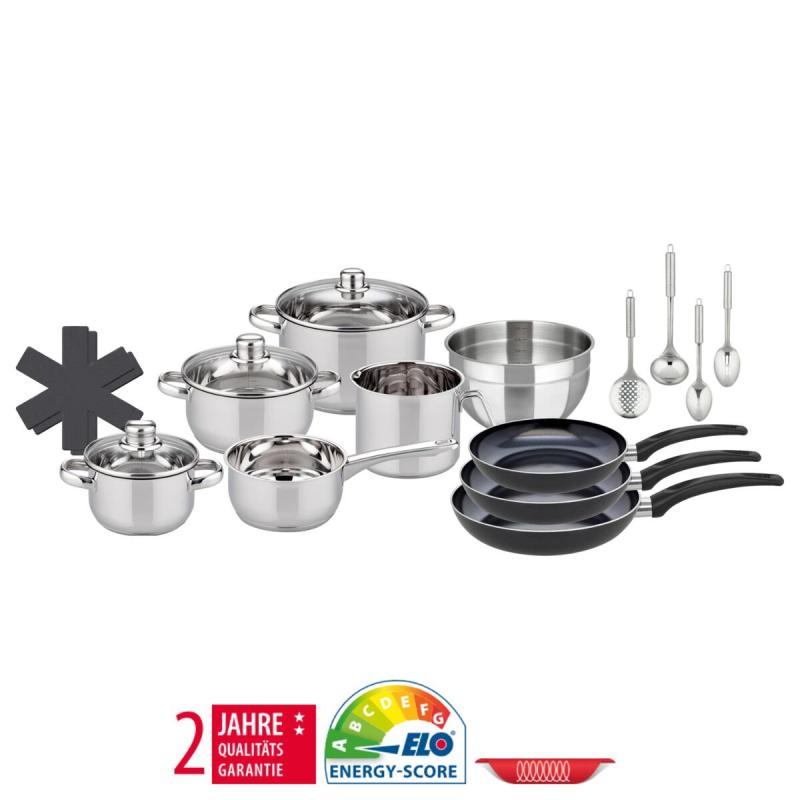 Sada obsahuje hrnce, pánve, rendlík, mlékovar, nerezovou mísu a praktické kuchyňské náčiní, takže je perfektním základem pro vaši domácnost. Hrnce a mísa jsou vyrobeny z vysoce kvalitní nerezové oceli s lesklým povrchem, zatímco pánve z lisovaného hliníku s nepřilnavým keramickým povrchem Excilon 2000 zajistí snadné a zdravé vaření s minimem tuku. Integrovaná měrná stupnice uvnitř hrnců usnadní přesné měření tekutin a skleněné poklice s nerezovým okrajem umožňují pohodlně kontrolovat průběh vaření. Energeticky úsporné sendvičové dno zaručuje rovnoměrné rozložení tepla a je vhodné pro všechny typy varných desek, včetně indukce. Všechno nádobí je vhodné do myčky nádobí a odolné vůči teplotám až do 240 °C (se skleněnou poklicí do 180 °C).