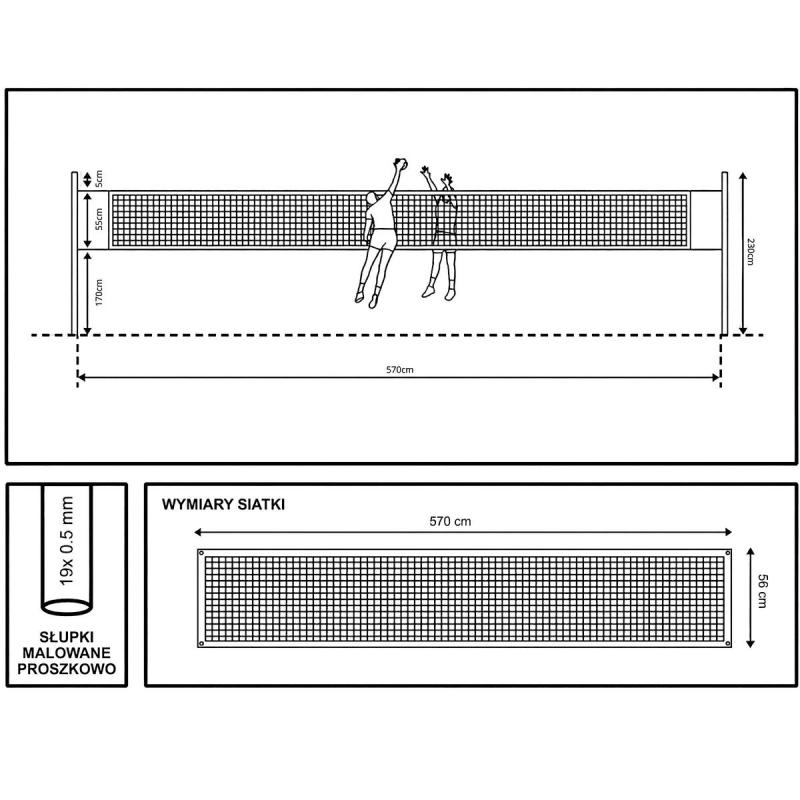 Chcete si užiť volejbal kedykoľvek a kdekoľvek? Tento kompletný volejbalový set s rozmermi 570 x 55 x 230 cm umožňuje rýchle a pohodlné vytvorenie ihriska na záhrade, pláži či na chate.\n\nPlne rozmerné parametre zaisťujú komfortnú rekreačnú hru s dĺžkou 570 cm a výškou 230 cm, čo zodpovedá štandardom pre voľnočasové aktivity. Vďaka tomu máte dostatok priestoru pre pohyb a realistické herné podmienky.\n\nRobustná konštrukcia tvorená oceľovými stĺpikmi o rozmere 19 mm x 0,5 mm s čiernym práškovým lakovaním zaručuje dlhú životnosť a odolnosť voči poveternostným vplyvom. Táto konštrukcia je vhodná pre vonkajšie použitie počas celej sezóny.\n\nOdolná sieť z polypropylénového materiálu s hrúbkou šnúry 1,5 mm a veľkosťou ok 8 x 8 cm zabezpečí správny odraz lopty a vydrží aj náročnejšie rekreačné zápasy. Spevnené horné a dolné okraje z materiálu 210D Oxford prispievajú k lepšiemu napnutiu a celkovej stabilite siete.\n\nKompletné vybavenie obsahuje všetko potrebné k okamžitému hranie. Súčasťou balenia je volejbalová lopta veľkosti 5 s priemerom 204 mm, praktická pumpička a štyri plastové kolíky pre pevné ukotvenie siete do zeme. Nemusíte tak dokupovať žiadne ďalšie doplnky.\n\nJednoduchý a rýchly montážny systém umožňuje ľahké postavenie aj demontáž bez nutnosti špeciálneho náradia. Plastové kolíky zabezpečia stabilitu aj na mäkkom povrchu, čo oceníte pri sezónnom využití v exteriéri.\n\nPodpora pohybu a zábavy je ideálna pre rodinné aktivity, priateľské stretnutia aj rekreačný tréning. Volejbal rozvíja koordináciu, kondíciu a podporuje tímovú spoluprácu, čo prispieva k príjemnému a aktívnemu tráveniu voľného času.\n\nStačí rozložiť sieť, napumpovať loptu a môžete začať hrať kdekoľvek podľa nálady. Tento set ponúka mobilitu, pohodlie a všetko potrebné pre volejbalové zápasy bez obmedzení.\n\nParametre:\n\n• Rozmery: 570 x 230 cm (šírka x výška)\n• Stĺpiky: oceľové, lakované práškovo, 19 x 0,5 mm\n• Materiál siete: polypropylén s taškou 210D Oxford\n• Rozmery siete: 570 x 55 cm\n• Priemer šnúry: 1,5 mm\n• Veľkosť ok: 8 x 8 cm\n• Súčasť balenia: sieť, stĺpiky, lopta veľkosti 5 (priemer 204 mm), pumpička, 4 plastové kolíky\n• Certifikácia: CE, zhodné s normou EN 71\n• Balenie: kartón 66 x 16,5 x 8 cm\n\nZnačka Enero sa zameriava na športové a rekreačné vybavenie podporujúce zdravý životný štýl a pohyb. Produkty sú vhodné ako pre deti, tak dospelých, ponúkajú spoľahlivosť a praktické využitie v rôznych podmienkach.\n\nTento volejbalový set je vhodný pre všetkých, ktorí hľadajú ľahko prenosné a rýchlo zostaviteľné riešenie pre volejbalové hry vonku. Vďaka kompletnému príslušenstvu zvládnete prípravu ihriska bez zbytočných komplikácií.\n\nHlavné prednosti zahŕňajú plne rozmerné herné parametre, odolnú konštrukciu, kompletné vybavenie a jednoduchý montážny systém, čo dohromady tvorí praktickú a univerzálnu sadu pre rekreačný volejbal. Tento set ocenia rodiny, športoví nadšenci aj rekreační hráči, ktorí chcú hrať kedykoľvek a kdekoľvek.\n\nVyberte si tento volejbalový set pre pohodlné a zábavné trávenie času vonku, ktorý vám umožní ľahko začať hrať bez starostí o ďalšie vybavenie.
