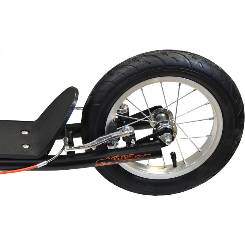 Pneumatiky s priemerom 16" vpredu a 12" vzadu sú plnené vzduchom a používajú automobilové ventily Schrader, čo prináša pohodlnú a plynulú jazdu aj na nerovnom povrchu. Silikónové profilované rukoväte zvyšujú komfort ovládania a zároveň zabezpečujú pevný úchop.