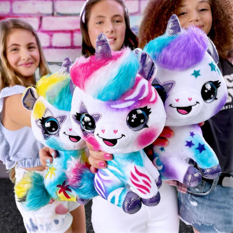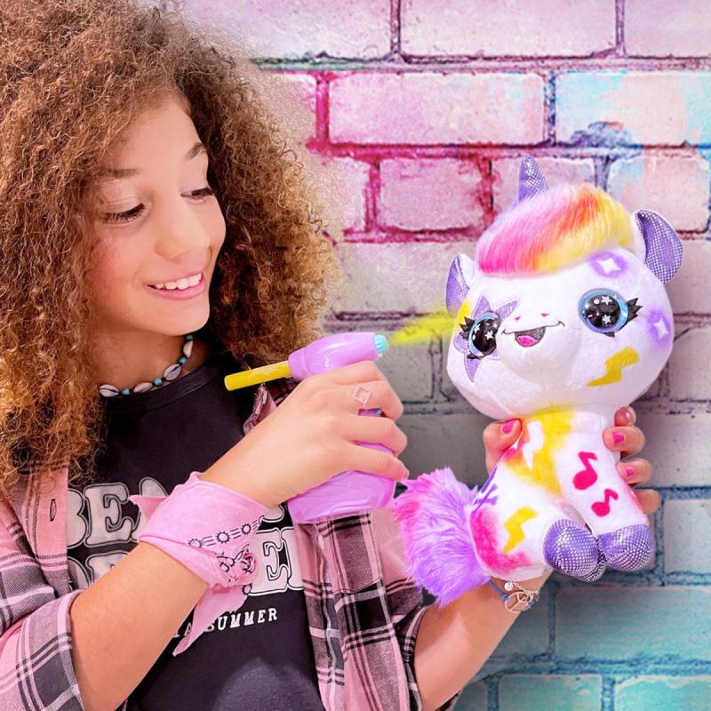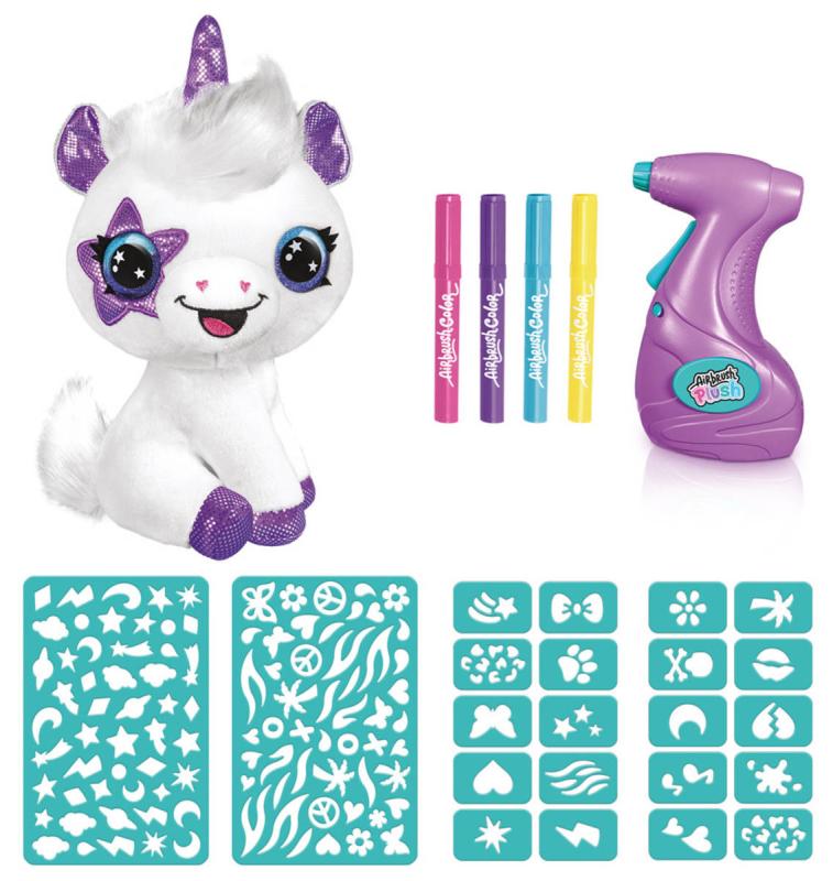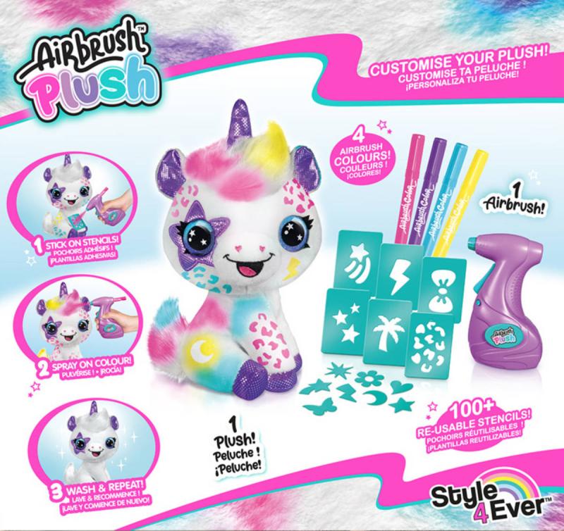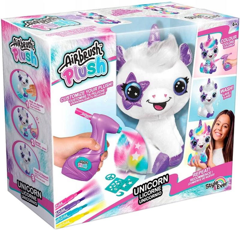 Airbrush studio. Jednorožec, kterého můžeš barevně posprejovat za pomocí airbrush pistole. Lehce omývatelný - lze použít opakovaně. Šablony k dozdobení součástí. Baleno v krabici.Plyšové zvířátko si můžeš pomocí airbrushe libovolně posprejovat, můžeš využít i samolepící šablony. Fantazii se meze nekladou. Pokud se ti vytvořený design přestane líbit, stačí plyšáka omýt nebo vyprat (pouze studenou vodou) a můžeš začít znovu.