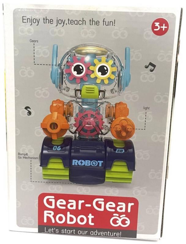 Robot se světelným a zvukovým efektem je interaktivní hračka určená pro děti od tří let, která podporuje kreativitu a rozvíjí fantazii. Robot vyniká svým zábavným designem, kdy průhledná plastová hlava odhaluje barevná ozubená kolečka, která se při zapnutí otáčejí a vytvářejí tak zajímavý vizuální efekt. Dvě barevné varianty robota – oranžovo-modrá a zeleno-modro-fialová – nabízí dětem možnost výběru podle jejich oblíbených barev.