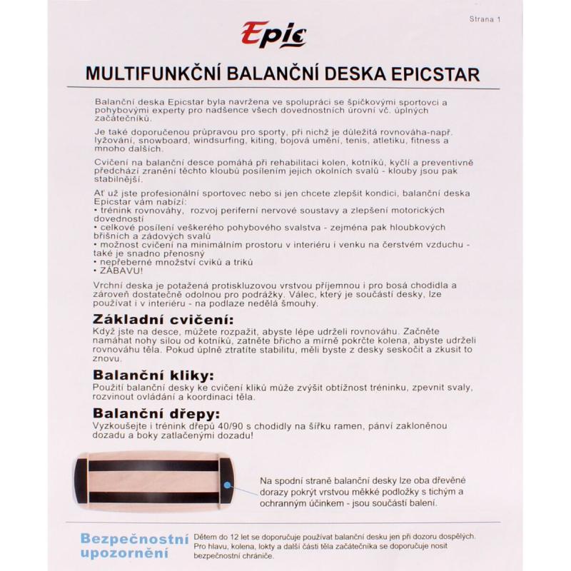 Multifunkční balanční deska Epicstar je výsledkem spolupráce s elitními sportovci a odborníky na pohyb. Ideální pro všechny, od úplných začátečníků až po zkušené sportovce. Je to výborná pomůcka pro sporty, kde je klíčová rovnováha - např. lyžování, snowboard, windsurfing, kiting, bojová umění, tenis, atletika, fitness a mnoho dalších. Cvičení na balanční desce Epicstar pomáhá při rehabilitaci kolen, kotníků, kyčlí a preventivně předchází zranění těchto kloubů posílením jejich okolních svalů - klouby jsou pak stabilnější.Vrchní deska balanční desky Epicstar je potažená protiskluzovou vrstvou příjemnou pro bosá chodidla a zároveň dostatečně odolnou pro podrážky. Válec balanční desky Epicstar lze používat i v interiéru, bez nutnosti použití koberce. Pro vyšší bezpečnost je deska zespoda vybavena koncovými zarážkami, na které můžete nalepit samolepicí měkké podložky pro zvýšenou ochranu podlahy.