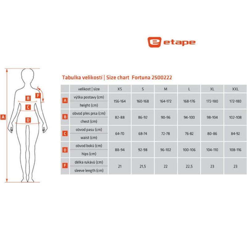 Dámský cyklistický dres Etape Fortuna ocení každá cyklistka, ať už na kole jezdí pravidelně či rekreačně. Dres s krátkým rukávem je vyrobený z elastického materiálu MicroCool – funkční elastický materiál z polyesterových mikro vláken, který velice rychle schne, odvádí pot a vlhkost od pokožky.Dres dále nabízí dlouhý přední zip, panely z funkční elastické síťoviny AirMeshTM pro větší komfort a 3 zadní kapsy pro uložení drobností. Díky použitým reflexním prvkům budete na cestě vždy dobře viděna. Velikostní tabulka v obrázcích. Uvedené hodnoty jsou pouze orientační a vhodná velikost se může lišit dle konkrétního typu postavy.8592201065398720