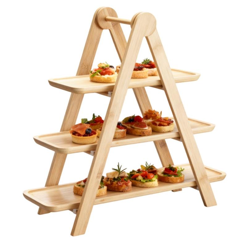 Třípatrový etažér z bambusu s pevnými PV klipy nabízí stabilní a elegantní řešení pro servírování dezertů, ovoce nebo sýrů.Elegantní třípatrový etažér vyrobený z přírodního bambusu je praktickým pomocníkem pro servírování dezertů, ovoce, sýrů i slaných pochoutek. Díky pevné konstrukci s PV klipy je stabilní a spolehlivý při každodenním použití i slavnostních příležitostech.