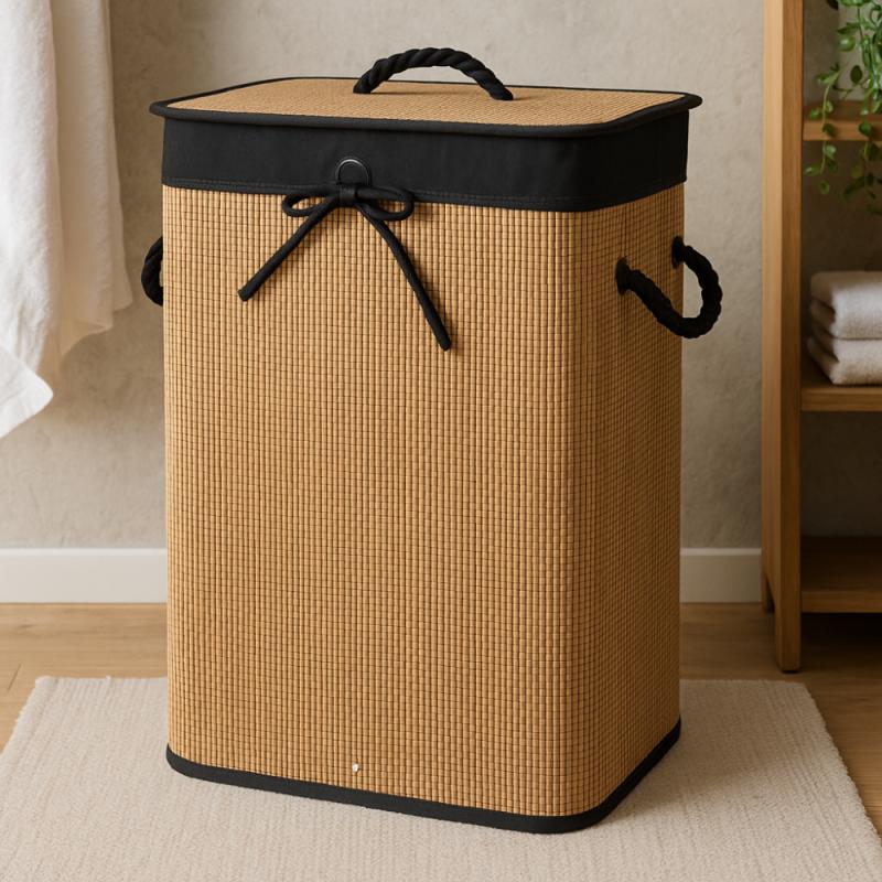 Koš na prádlo z bambusu – přírodní design s kontrastními detailyPraktický a elegantní koš na prádlo vyrobený z kvalitního bambusu (Phyllostachys heterocycla), ideální pro moderní i rustikální interiéry.