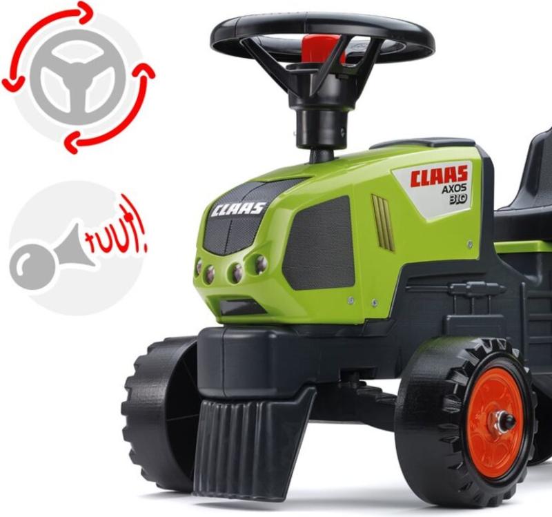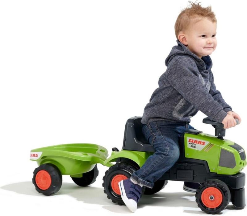 Plastové detské odrážadlo s realistickým dizajnom traktora Claas Axos a praktickou vlečkou, vhodné pre deti od 1 do 3 rokov. zobraziť celý popis