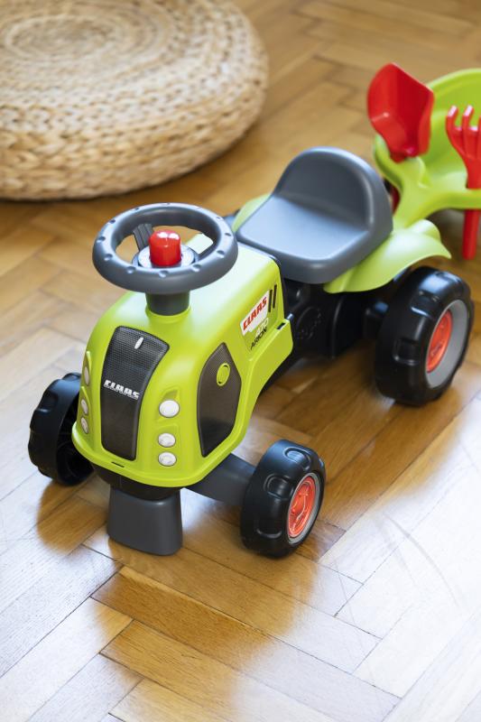 Falk Traktor Baby Claas s volantom, klaksónom, prívesom, hráblami a lopatou