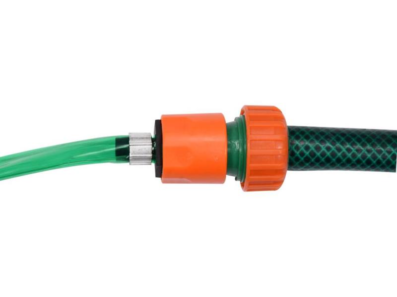 Hadice vybavená 2 konci, oba pro připojení rychlospojkou. Jeden konec s maticí. Šroubovací uzávěr - uzavření systému, odšroubovaný - pokračování systému. Spojení mezi hadicí postřikovače a tradiční hadicí je možné pomocí univerzální rychlospojky. Její výběr závisí na průměru vaší zahradní hadice (1/2", 3/4" nebo 1"). Doporučuje se použít plastové rychlospojky (mosaz nemusí pasovat).