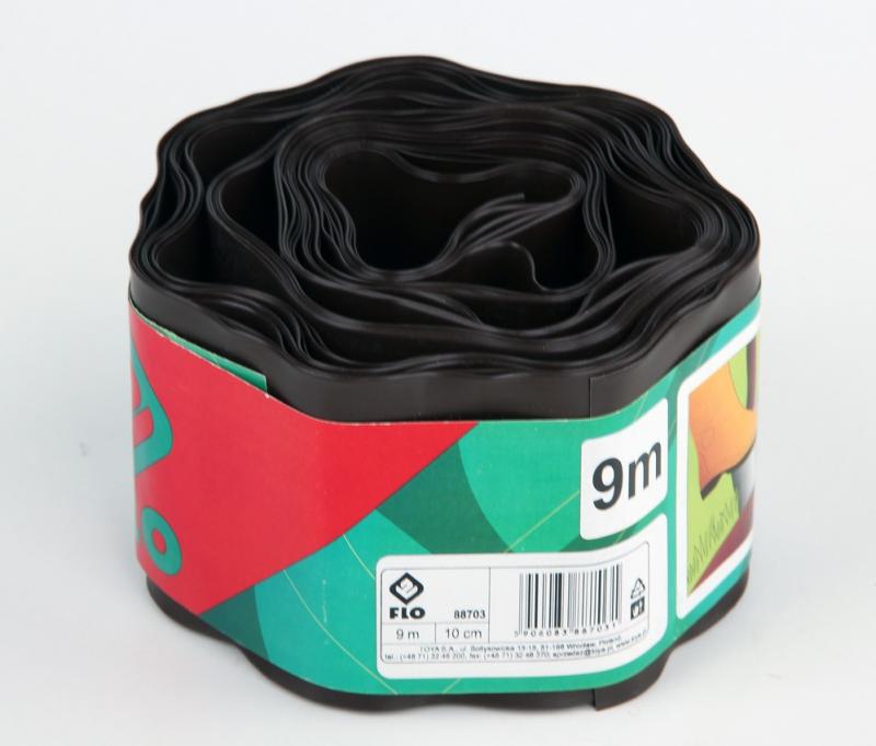 Plastový okraj trávniku. Vysoký 100mm, dlouhý 9m. Hnědá barva. FLO je stabilní, rychle se rozvíjecí řada zahradnických potřeb.