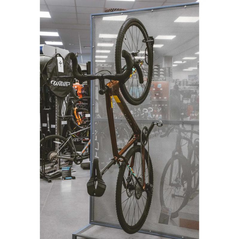 Tento držák na jízdní kolo umožňuje bezpečné a praktické zavěšení za přední kolo přímo na zeď. Je vybaven gumovou ochranou háku, která zabraňuje poškození laku kola a zároveň zvyšuje stabilitu zavěšení.