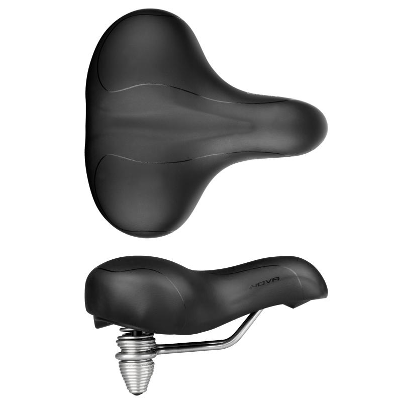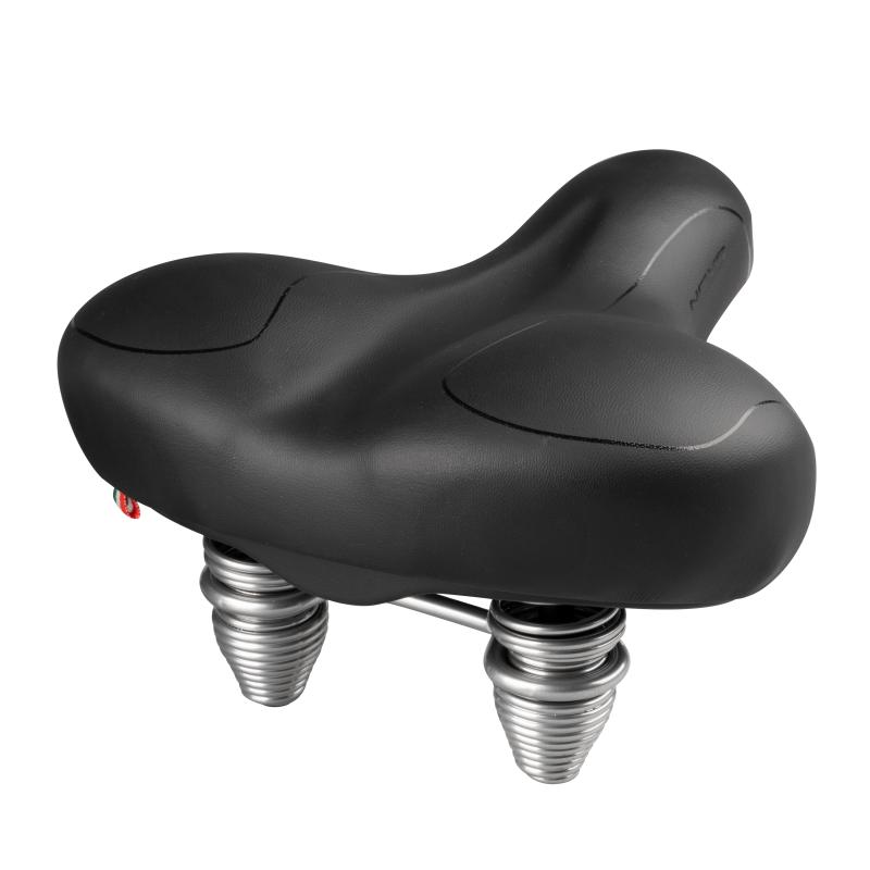 Velmi široké a pohodlné sedlo s ocelovými vzpěrami a povrchem z umělé kůže, vhodné pro pohodlnou jízdu na kole. zobrazit celý popis