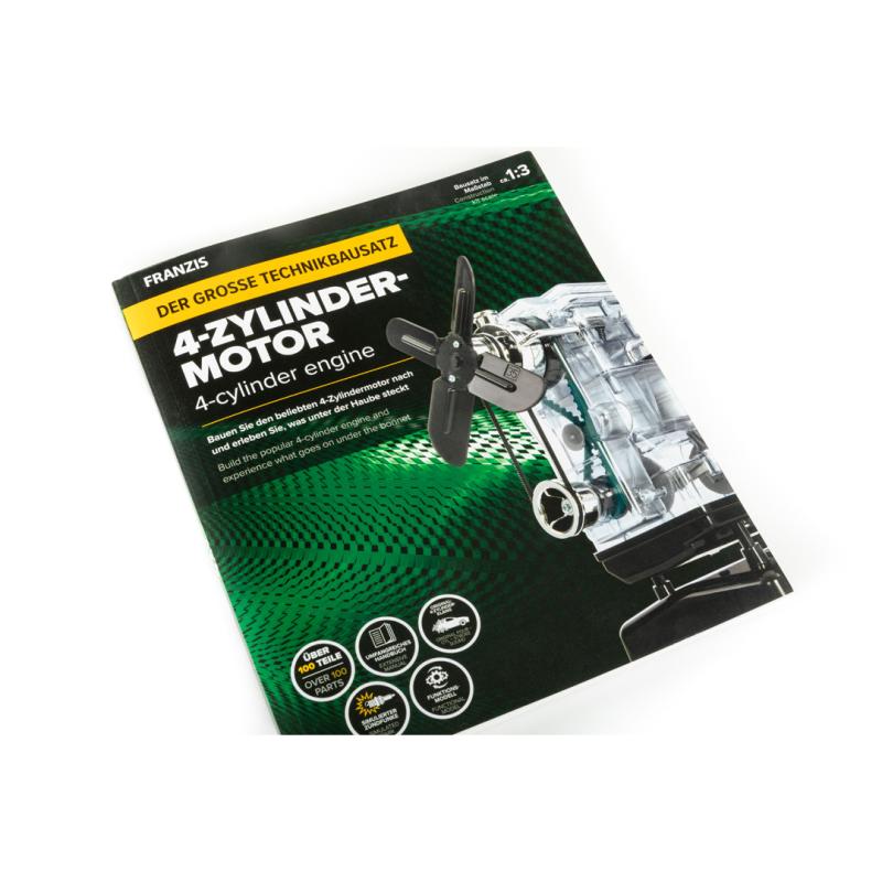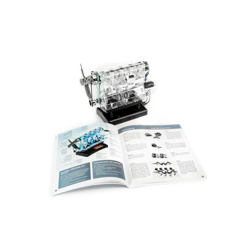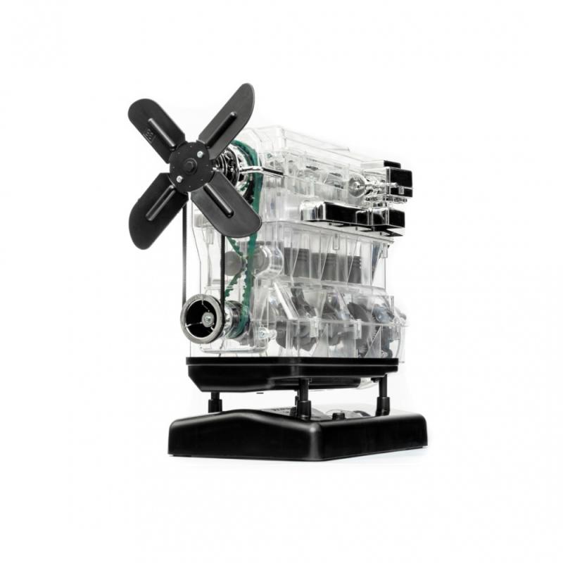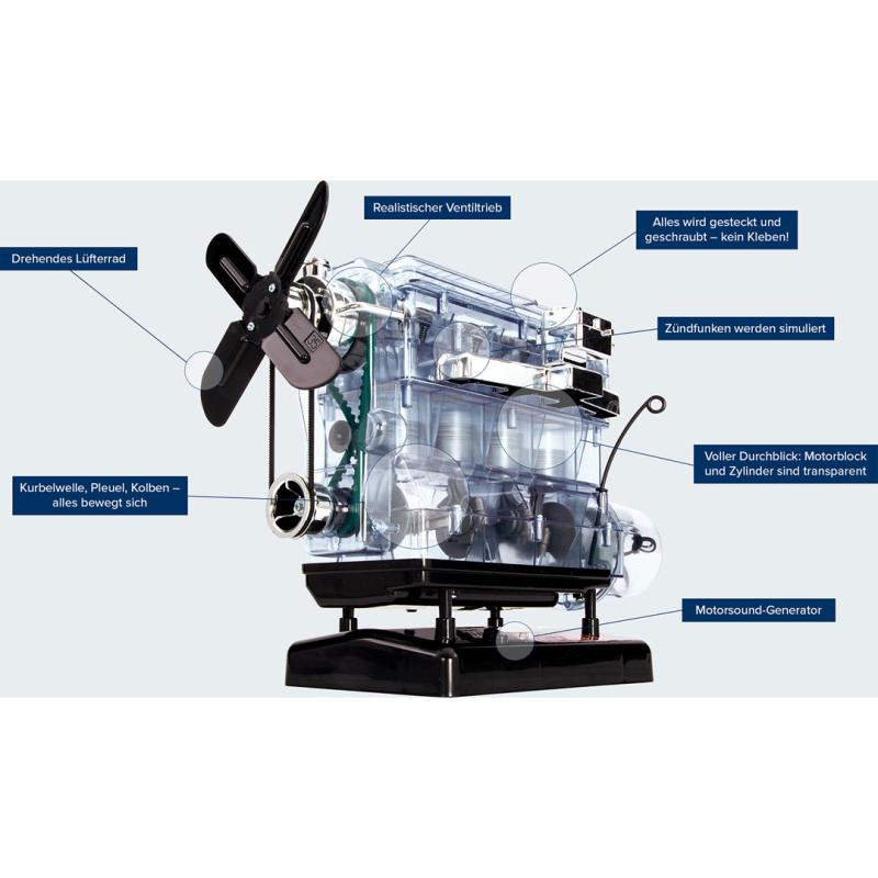 Vytvorte si obľúbený 4-valcový motor vo veľkej mierke 1:3. Preskúmajte, čo sa skrýva pod kapotou vášho auta! Kompletné balenie obsahuje viac než 100 komponentov a bohato ilustrovaný manuál, ktorý nenechá nezodpovedané žiadne otázky týkajúce sa spaľovacích motorov a ich možného využitia. Zostavte si detailný, priehľadný model motora, v ktorom sa všetky časti pohybujú rovnakým spôsobom ako u väčšieho modelu. Komponenty je možné ľahko zasunúť a zašróbovať - bez akéhokoľvek lepidla. Objavte jednotlivé časti motora a ich funkciu. S priehľadným púzdrom môžete sledovať dráhu piestov vo valcoch vášho modelu. Môžete sa pozrieť, ako funguje kľukový hriadeľ, vačkový hriadeľ a ventily a sami si nastaviť časovanie zapaľovania.
