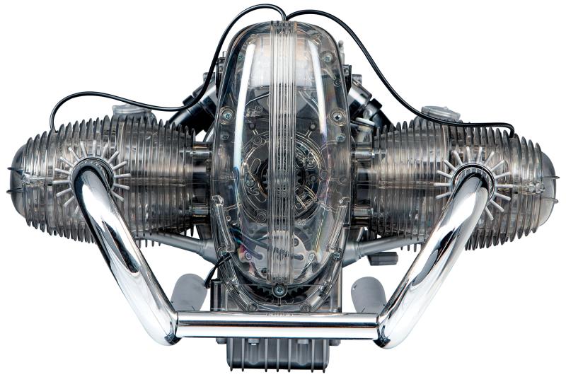 Postavte si priehľadný funkčný model (mierka: 1:2) 2-valcového motora boxer z viac než 200 dielov za približne tri hodiny! Všetky diely sa pohybujú ako originál: kľukový hriadeľ, piesty, ventily, simulovaná zapaľovacia iskra, fungujúci rozdeľovač zapaľovania, poháňané koleso ventilátora. So zvukovým modulom!