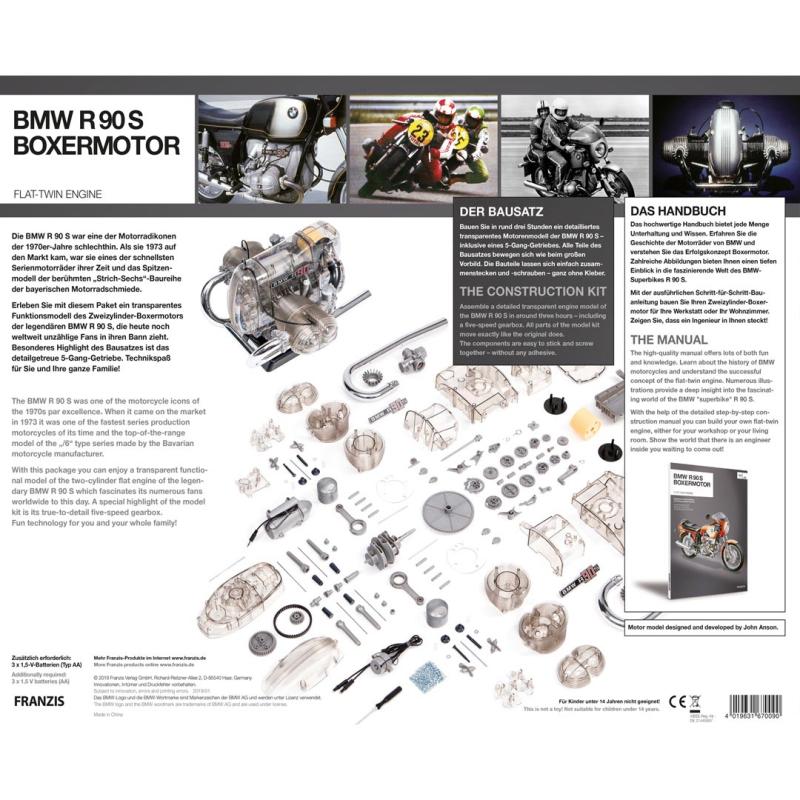 Stavebnica Franzis prináša slávny dvojvalcový motor boxer z R 90 S na váš stôl ako priehľadný funkčný model v mierke 1:2. Zapojte a zaskrutkujte model dokopy a zažite detailnú interakciu 5-stupňovej prevodovky s motorom.