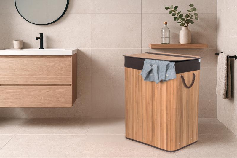 Jak vybrat nejlepší koš na špinavé prádlo? Co se materiálu koše týče, doporučujeme jednoznačně bambus. Je odolný vůči vlhkosti, takže jej můžete bez obav umístit do koupelny nebo servisní místnosti s pračkou. Zároveň je i vizuálně velmi příjemný – kombinace přírodního materiálu a barevně sladěné vložce a držadlům evokuje pocit čistoty, navíc se i hodí k jakémukoliv interiéru.