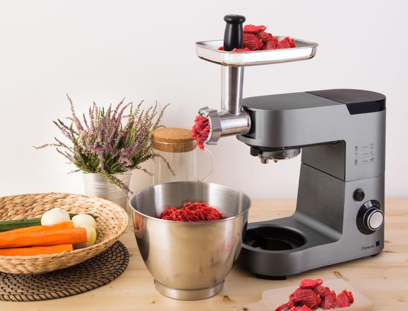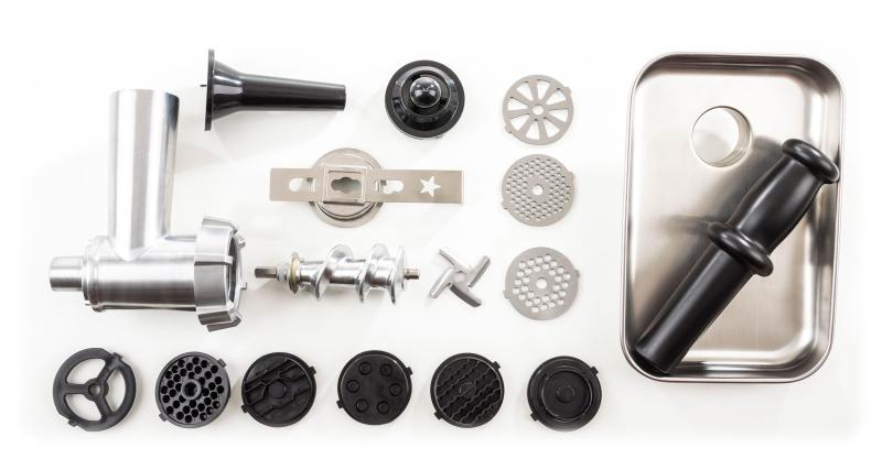 - Mlýnek na maso obsahuje 3 velikosti mlecích destiček pro různou hrubost masa. Příprava sekané, karbanátků nebo třeba výborného tatarského bifteku je pro něj hračkou a pro vás radostí.