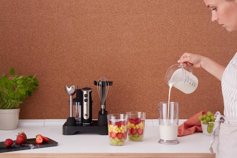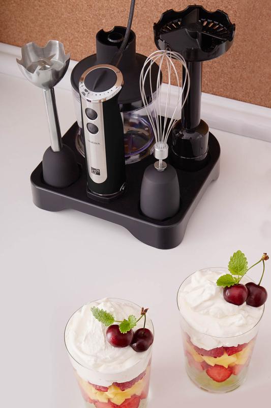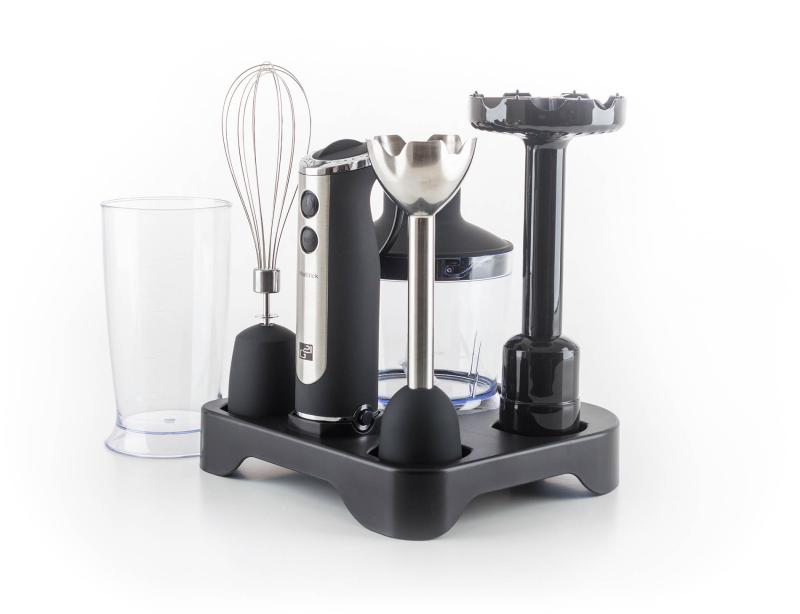 Celé tělo mixéru je kovové. Krásný design a promyšlený tvar vám umožní absolutně pohodlnou manipulaci i držení. Mysleli jsme na všechno, takže oceníte i vstřícně umístěné ovládací prvky a praktický stojan, do kterého mixér i s příslušenstvím snadno umístíte.Nepřijde k vám sám, vezme s sebou pomocníky!