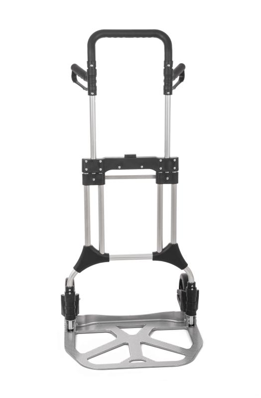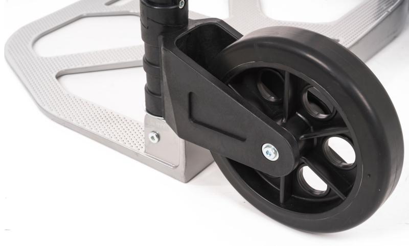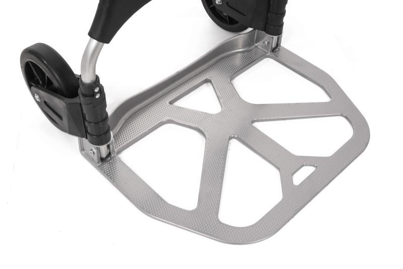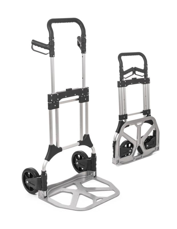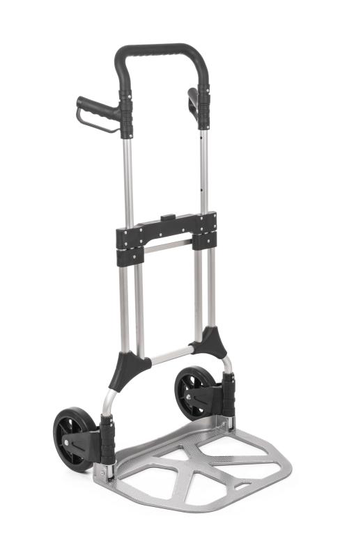 Nosnost 200 kg, celohliníkový rám, lopata 42,5 × 59 cm, kolečka o průměru 20 cm, skládací, teleskopická rukojeť.