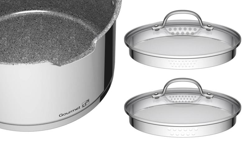 Celonerezová sada nádobí G21 Gourmet Miracle je ze speciální potravinářské oceli 18/10 CrNis s vnitřním nepřilnavým povrchem GREBLON® C3+ s vysokou tvrdostí a odolností. Všechny hrnce i pánve mají silná sendvičová dna pro dokonale rovnoměrné rozvádění tepla a jsou vhodné pro každý typ ohřevu. Díky svým jedinečným vlastnostem a dokonalému provedení je greblonové nádobí v nadčasovém designu velmi oblíbené a vydrží dlouhé roky.