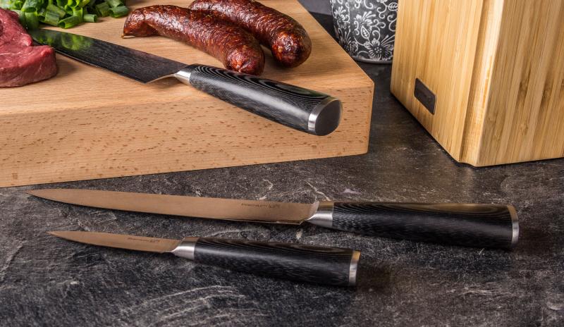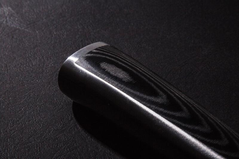 Rukojeť je vyrobena z extra pevného a odolného laminátového materiálu, nazývaného Micarta. Micartu tvoří plátno nebo skelná tkanina s termostatickou pryskyřicí. Výsledkem je pevná, houževnatá rukojeť, která nepodléhá zkáze času. Hladké, rovné, čisté linie těchto nožů se stanou ozdobou každé kuchyně.Prodloužená záruka 2 + 2 roky