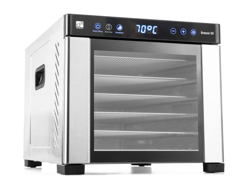 Horizontální nerezová sušička potravin s UV lampou, dvířky, časovačem, 6 sušícími platy a 6 jemnými síty suší ovoce, zeleninu i další suroviny naprosto rovnoměrně. Čím vás ještě nadchne?Horizontální sušička potravin G21 Breezer je menší sestrou sušičky G21 Mistral. Se svými 6 nerezovými sušícími tácy a 6 jemnými sušícími vložkami je díky kompaktnějšímu provedení ideální pro domácí použití nebo do provozů s menší pracovní plochou. Veškeré ovoce, zeleninu, bylinky, houby i maso usuší dokonale, rovnoměrně a jednoduše. Nemusíte přeskládávat plata ani otáčet suroviny. Dokonce se nemusíte zabývat ani údržbou sušičky, díky použitým materiálům je odolná a snadno se čistí.