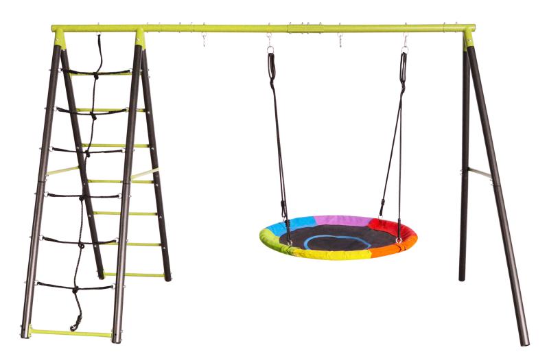 Zahradní houpačka s pohodlným houpacím kruhem o průměru 100 cm. Odolná a stabilní kovová konstrukce se žebříkem a lezeckou sítí, univerzální využití. zobrazit celý popis