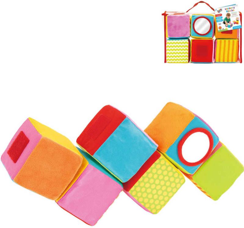 Set látkových kostek s molitanovou výplní s různými texturami pro cvičení vnímání a stranami opatřenými suchým zipem, který umožní kostky různým způsobem připojovat k sobě. Kostky jsou vyrobené z lesklého,
