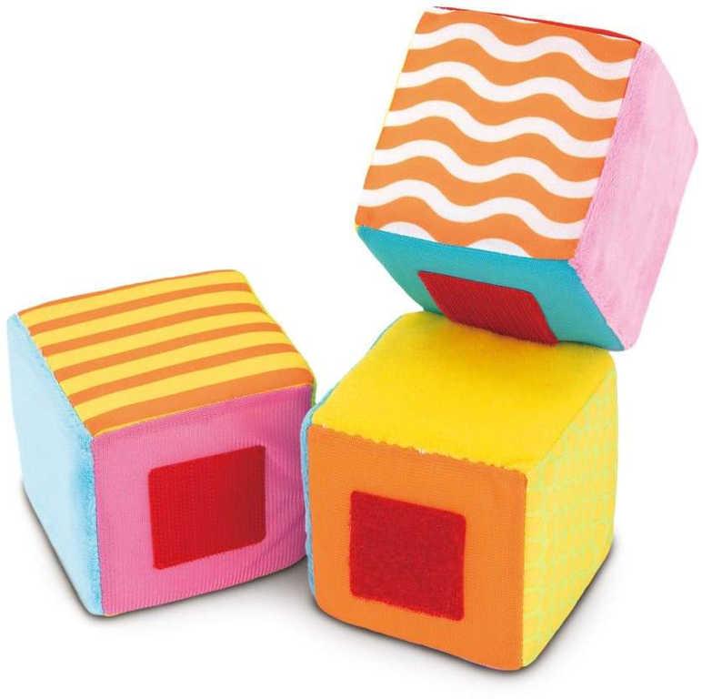 Měkké kostky pro nejmenší děti. S těmito kostkami zažiješ mnoho zábavy. Díky suchému zipu je můžeš spojit. Různé materiály na kostkách bude pro děti zajímavý na dotyk. Obsahuje 6 kostek.