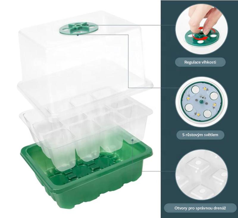 - integrované LED růstové světlo dodává rostlinám potřebné spektrum pro ranou fázi života, podporuje zakořeňování, tvorbu chlorofylu a akumulaci sacharidů, což zajišťuje zdravější a silnější sazenice i při nedostatku slunečního svitu