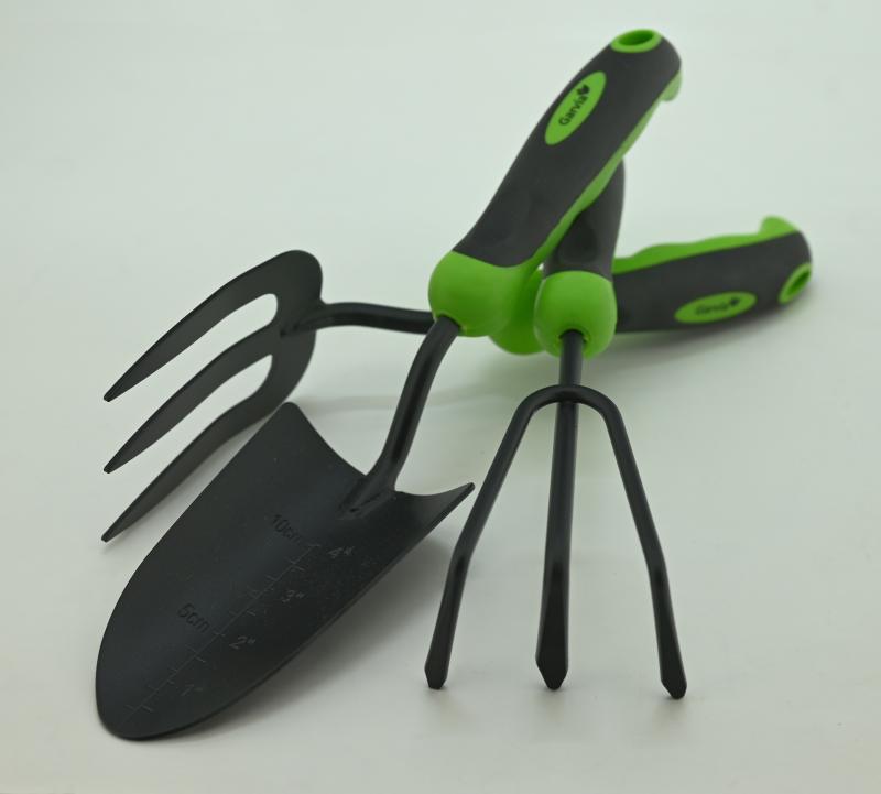 Lopatka je opatřena lžící s rozměry 14,5 x 8 cm (celkové rozměry 34 x 8 cm) a je doplněná hloubkoměrem (cm / palce), je tak vhodná zejména pro výsadbu, ale i další zahradní činnosti. Kultivátor s rozměry 28 x 8 cm je určený ke kypření půdy, provzdušnění zeminy, ale i odstranění plevele. Hrabičky s rozměry 32 x 7,5 cm jsou ideální pro úpravu záhonů, rozhrnutí půdy a sběr rostlinného odpadu.