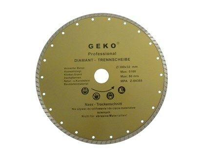 Precizní diamantový řezný kotouč GEKO s nepřerušovaným diamantovým segmentem a prolamováním po celém obvodu. Díky prolamování turbo kotouč chladí lépe jak obyčejný celoobvodový, lépe vynáší obroušený materiál z řezu ven a řezání je rychlejší, avšak může docházet ke štípání hran a výsledný řez je širší. Turbo kotouč se hodí pro hluboké řezání tvrdých stavebních materiálů jako je např. beton, zdivo, kámen, zámkový dlažba apod. S turbo kotoučem je možné řezat za mokra i za sucha.