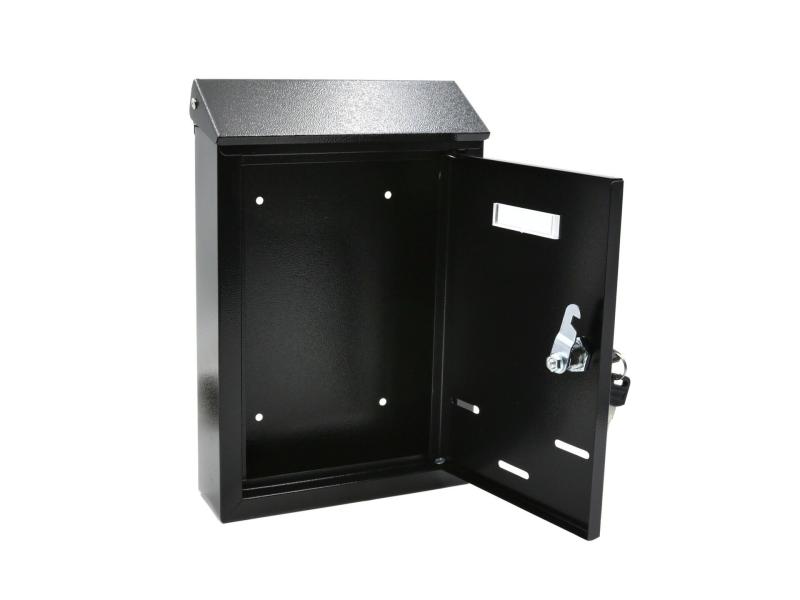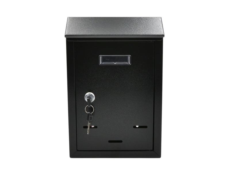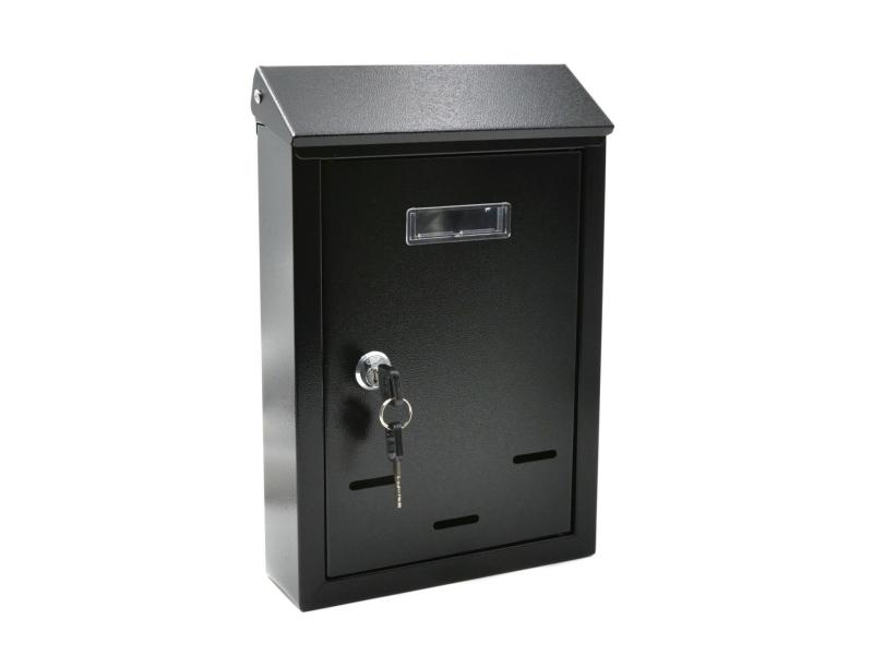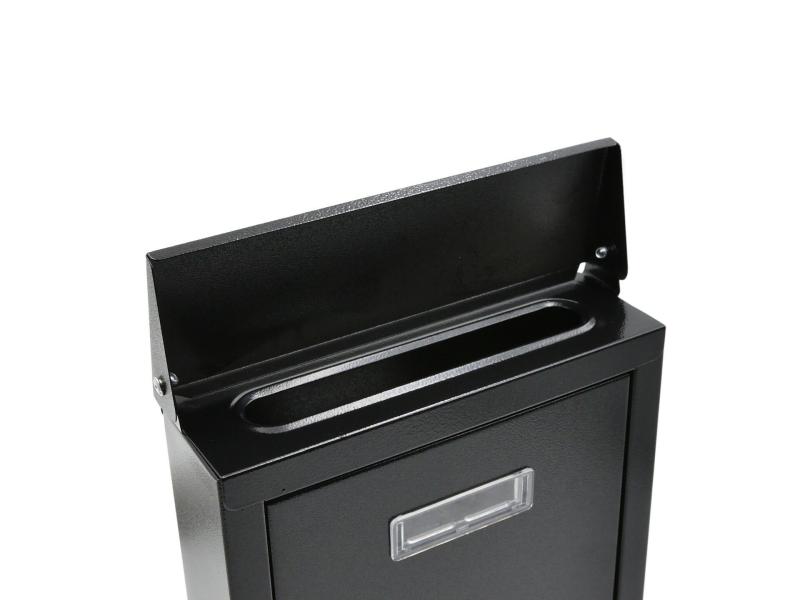 Multifunkční poštovní schránka vyrobena z ocelového plechu s vysokou odolností proti korozi je práškově lakovaná černou barvou. Schránka je přizpůsobená pro korespondenci ve formátu A4 a kombinuje vysokou funkčnost, odolnost a elegantní vzhled. Malá stříška na přední straně zajišťuje ochranu obsahu schránky proti povětrnostním vlivům a čtyři montážní otvory na zadní straně usnadňují její instalaci na plot nebo stěnu budovy. Přední dvířka jsou uzamykatelná, horní vhoz je chráněn před deštěm výklopnou klapkou a průhledný plastový panel umožňuje umístit informační štítek se jménem nebo adresou.