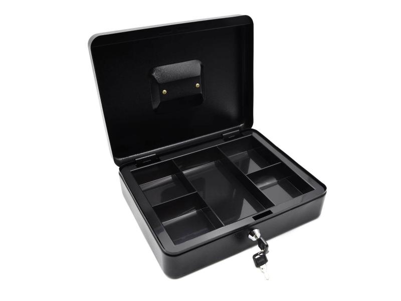 Praktická kovová schránka na peníze uzamykatelná klíčem je vybavena nosnou rukojetí a vnitřním plastovým pořadačem na mince.