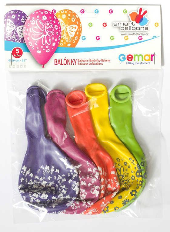 GEMAR GS110 - Kvalitní latexové jednobarevné nafukovací balonky Gemar v mixu různých barev s bílým potiskem (motýlci, rostlinné motivy), v balení v sáčku po 5ti kusech. Lze použít jako dekoraci.