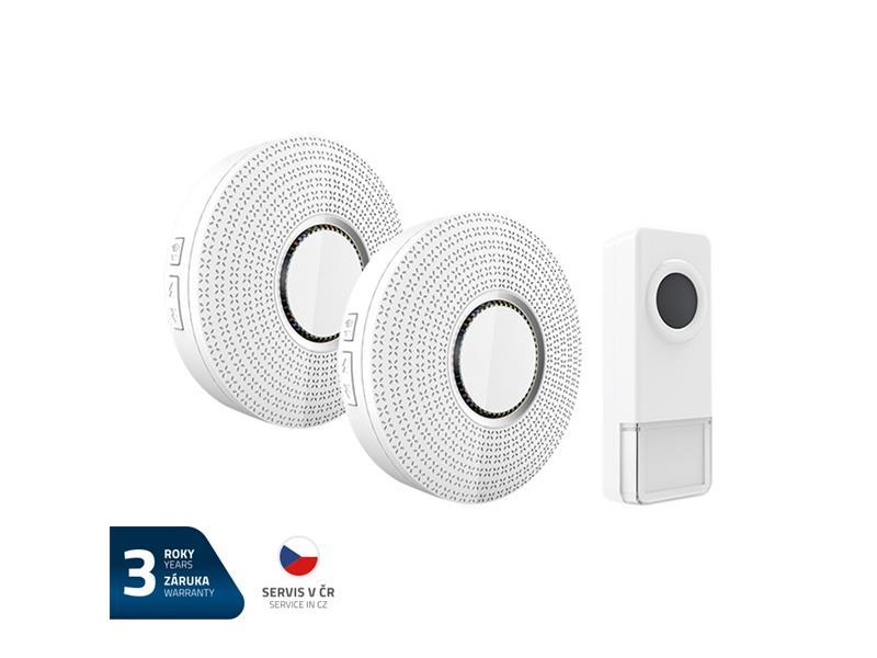Součást balení: 2 zvonky, tlačítko, návod, 4 šroubky, 4 hmoždínky, šroubovák