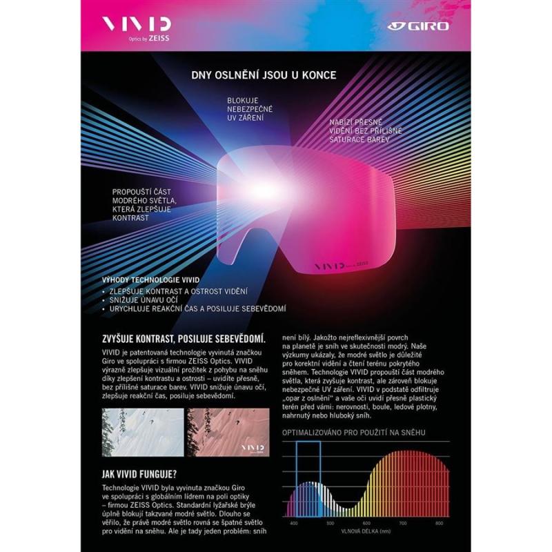 VIVID je speciální technologie vyvinutá značkou Giro ve spolupráci s Zeiss Optics, která výrazně zlepšuje vizuální vnímání na sněhu. Umožňuje vidět přesně a s lepším kontrastem, což pomáhá lépe číst terén a reagovat na jeho nerovnosti. Na rozdíl od běžných brýlí, které blokují modré světlo, VIVID propouští část modrého světla, jež je důležitá pro správné vnímání sněhu, a zároveň filtruje škodlivé UV záření. Díky tomu uvidíte plastický terén včetně boule, ledových ploten či hlubokého sněhu, což zvyšuje bezpečnost a jistotu při jízdě.