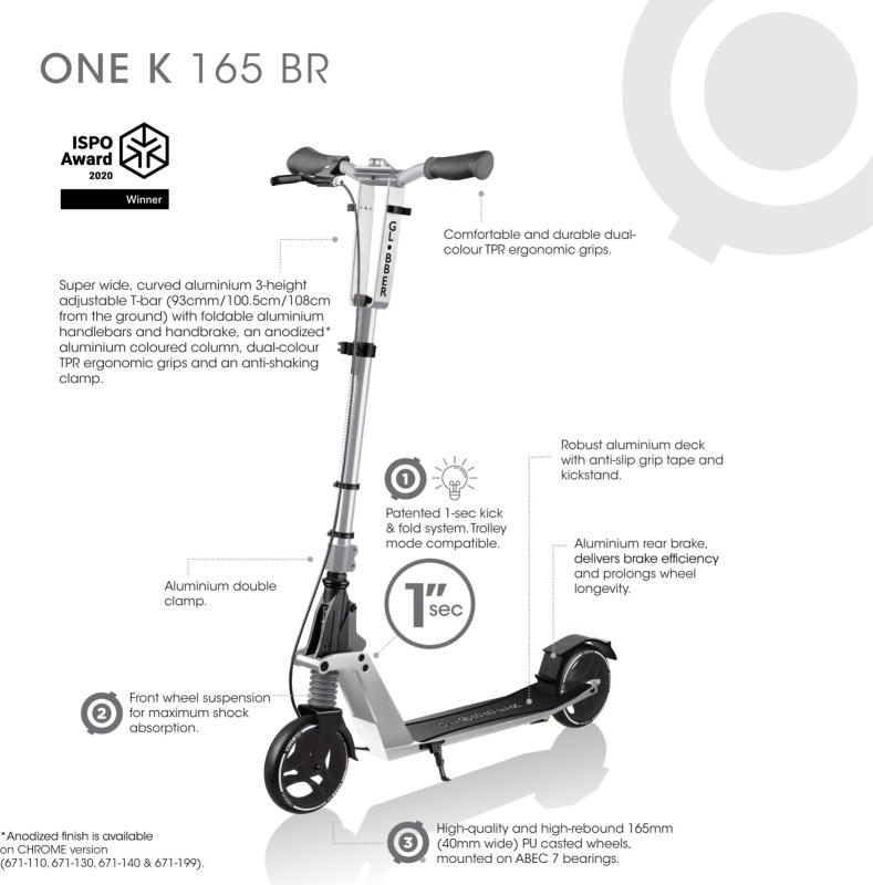 Koloběžka se 3 výškovými nastaveními je vybavena mimořádně širokou zakřivenou hliníkovou tyčí T, sloupkem z masivního hliníku o průměru 33 mm a sklopnými hliníkovými řídítky s dvoubarevnými ergonomickými úchyty TPR a protiotřesovou svorkou.48952244025891900