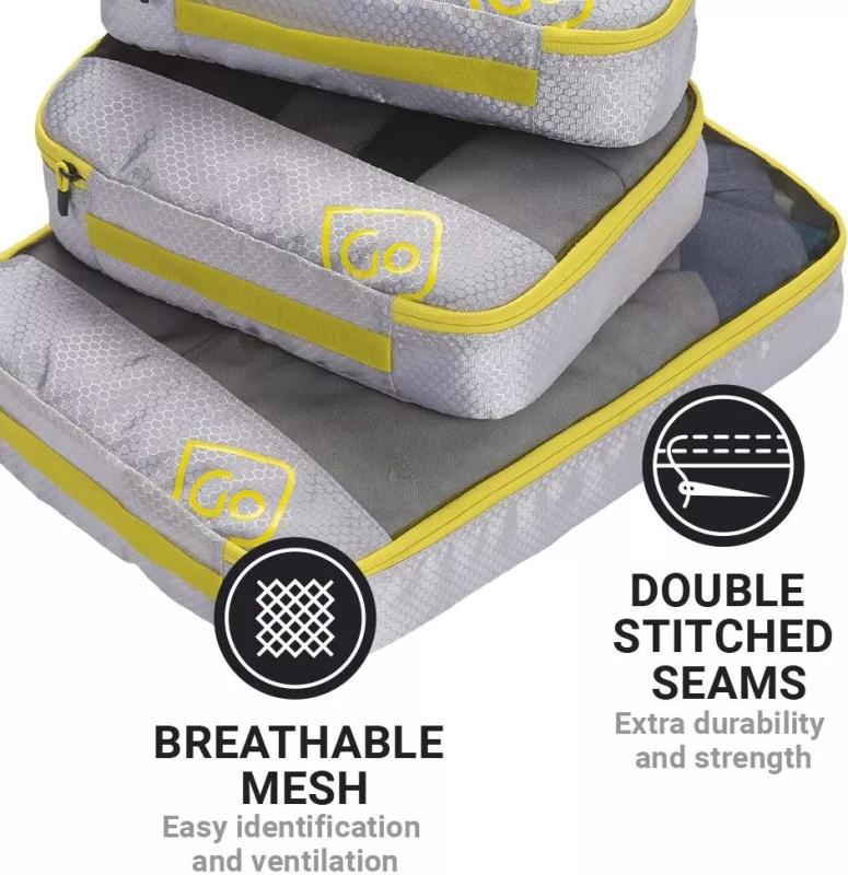 Organizace zavazadla může být jednodušší a přehlednější díky této sadě tří obalů, které pomáhají udržet oblečení a doplňky oddělené a snadno dostupné. Každý obal je vybaven prodyšným víkem ze síťoviny, které umožňuje rychlou kontrolu obsahu bez nutnosti otevírání. Díky zipovému uzavírání po celé délce jsou věci bezpečně uloženy a přístup k nim je pohodlný.