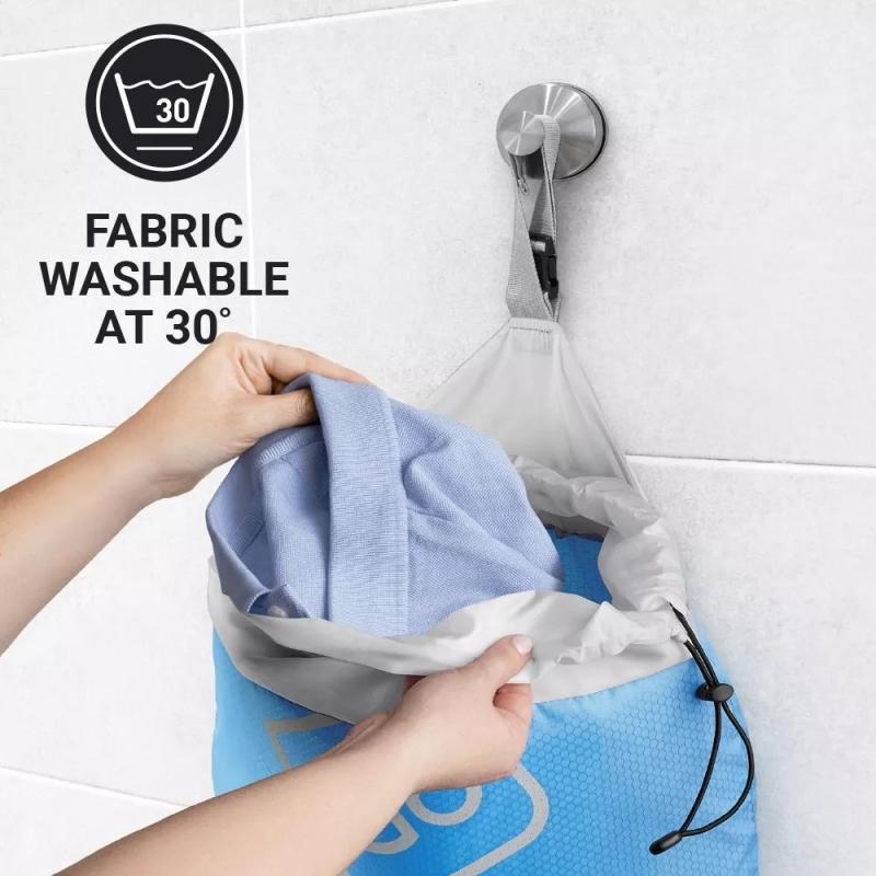 Modrý vak o objemu 15 litrů slouží k praktickému uložení a oddělení špinavého prádla, uzavírá se stahovací šňůrkou a má textilní poutko s plastovou přezkou pro snadné zavěšení.