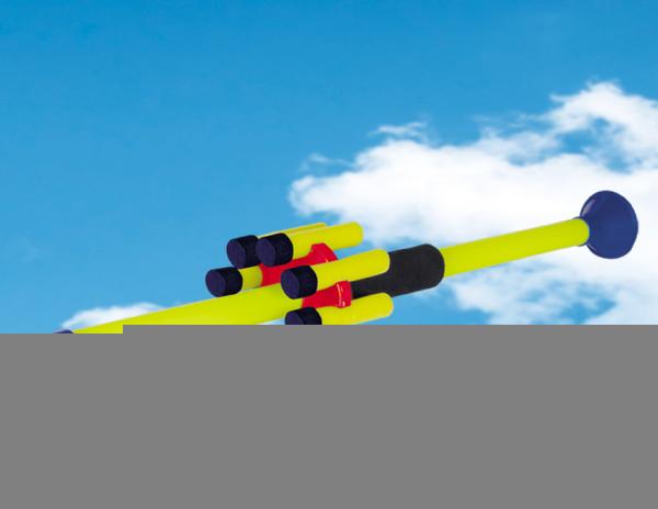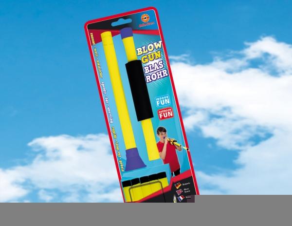 Naplňte foukačku pěnovou šipkou, foukněte krátce a silně a šipka poletí vzduchem závratnou rychlostí. Šipky jsou s přísavkami, drží se na hladkých plochách.