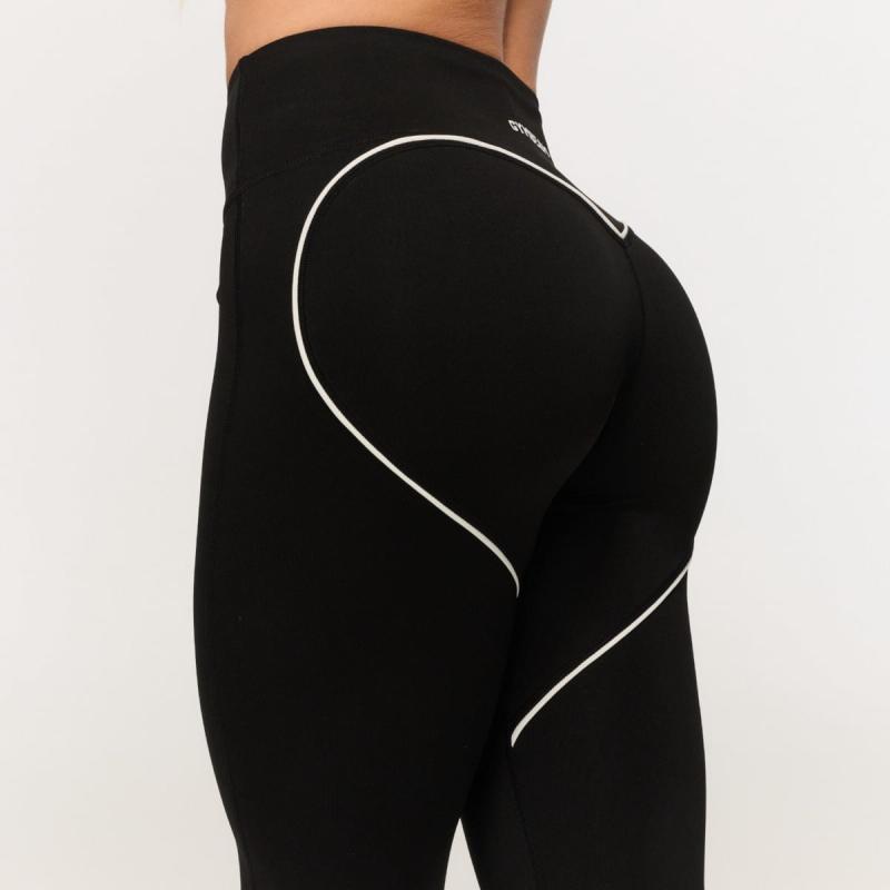 Legíny mají dlouhý střih, který se přizpůsobí postavě, a vysoký pas zaručuje pevné držení i při hlubokých dřepech. Konstrukce bez předního švu a bez kapes přináší maximální pohodlí bez zařezávání nebo tření. Výrazným prvkem je kontrastní lemování ve tvaru srdce na zadní straně tvořené tenkými bílými proužky, které opticky tvaruje pozadí a zdůrazňuje přirozené křivky.